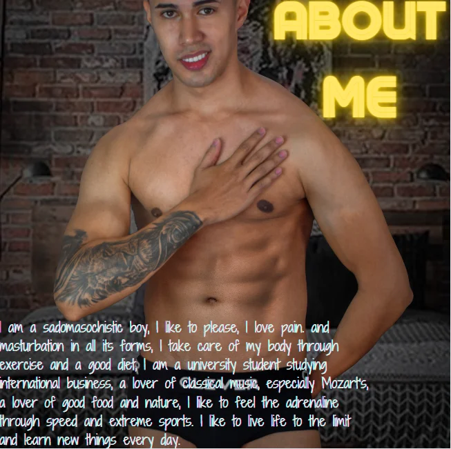 Here you will find a guy full of energy, willing to please different types of desires, sexual, erotic and emotional. In my shows I love to have a good conversation, to exercise, to play with my ass, to feel the vibrations with the interactive toy, to play with my nipples and body, to finish with a big load of milk. I am an open-minded boy willing to experience and know the true pleasure at your side, I wait for you in my room so that together we can spend the best moment of our lives.